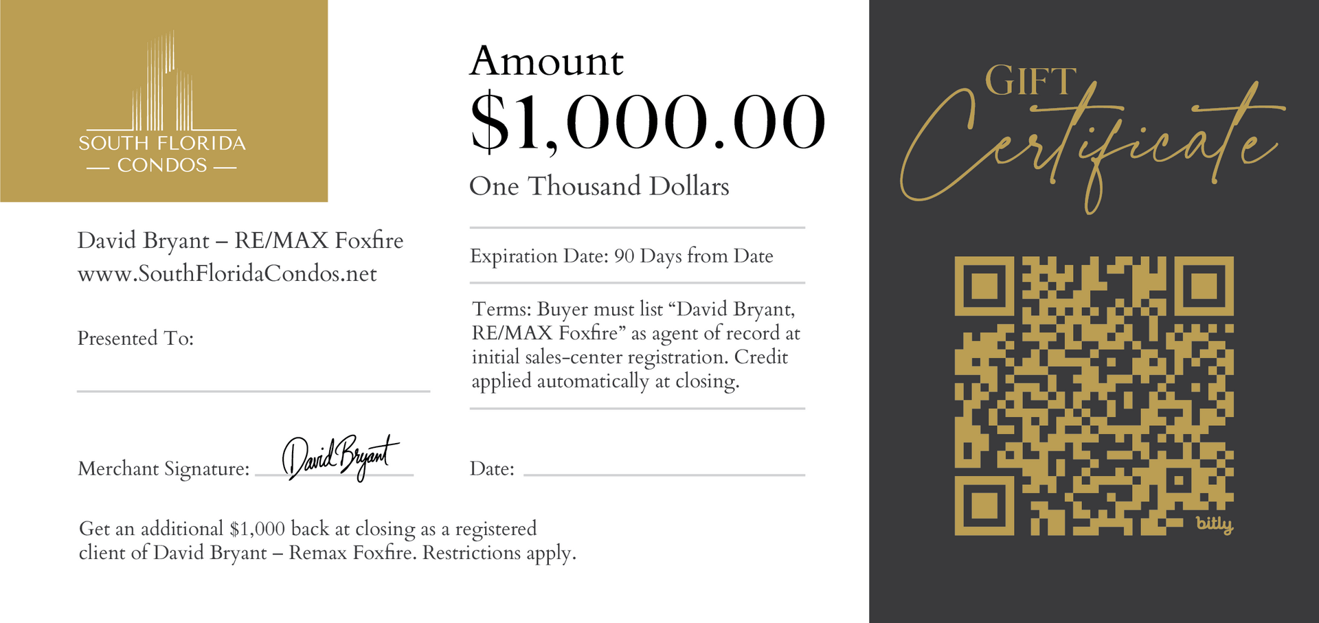 Register David Bryant of South Florida Condos | RE/MAX Foxfire as your agent and complete the short form below. We’ll email you a digital certificate worth $1,000 back at closing on any condo you purchase with David.